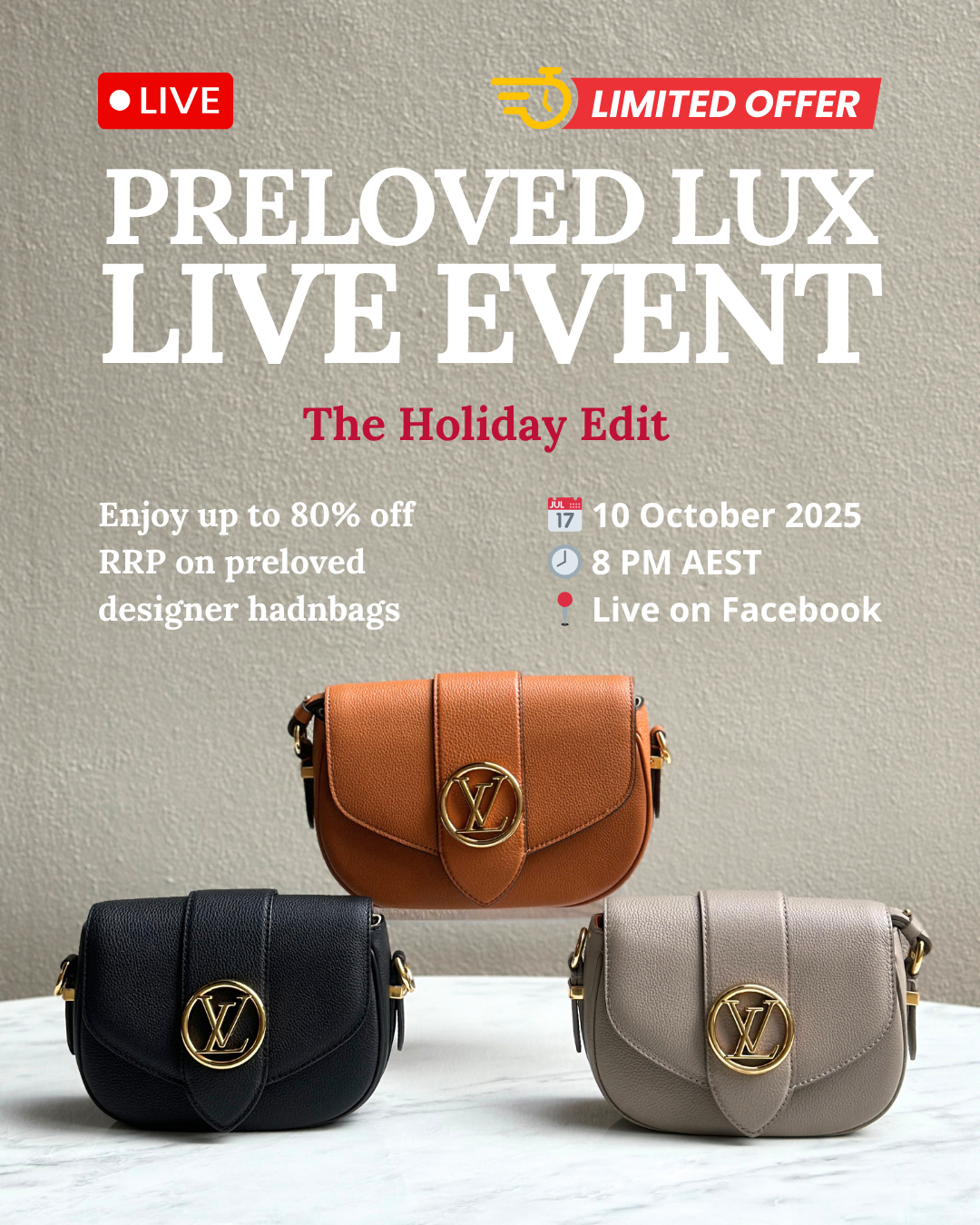 Join our exclusive Instagram and Facebook Live Sales and uncover one-of-a-kind preloved pieces you wonโt find anywhere else. From iconic handbags to statement outfits, each item is handpicked for style, authenticity, and value.